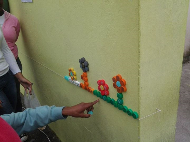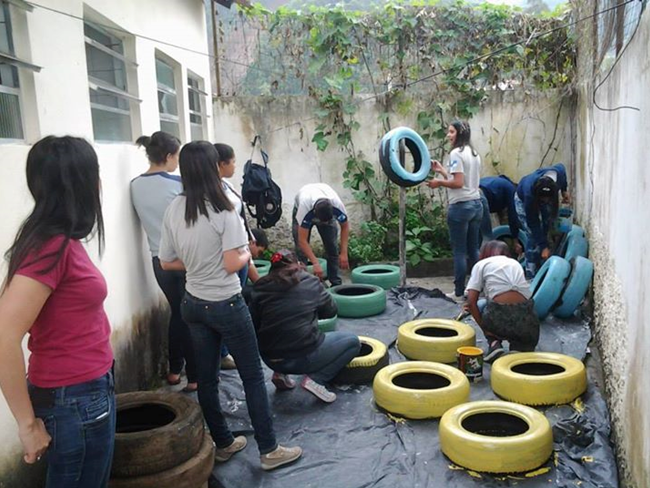 Alunos do Fany Niskier pintando pneus para a horta e fazendo mosaico com tampinhas.