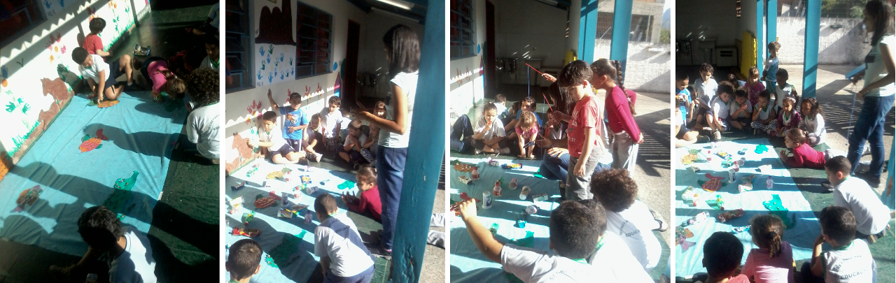 PESCARIA ECOLÓGICA: Foi realizada uma "pescaria ecológica" com embalagens dos lanches que os estudantes consumiram durante o recreio. As imagens de animais foram confeccionadas pela turma utilizando materiais recicláveis como: as escamas dos peixes (feitas de garrafa PET), colagens (com diferentes materiais) da capivara e jacaré feito de sementes de pinhão.