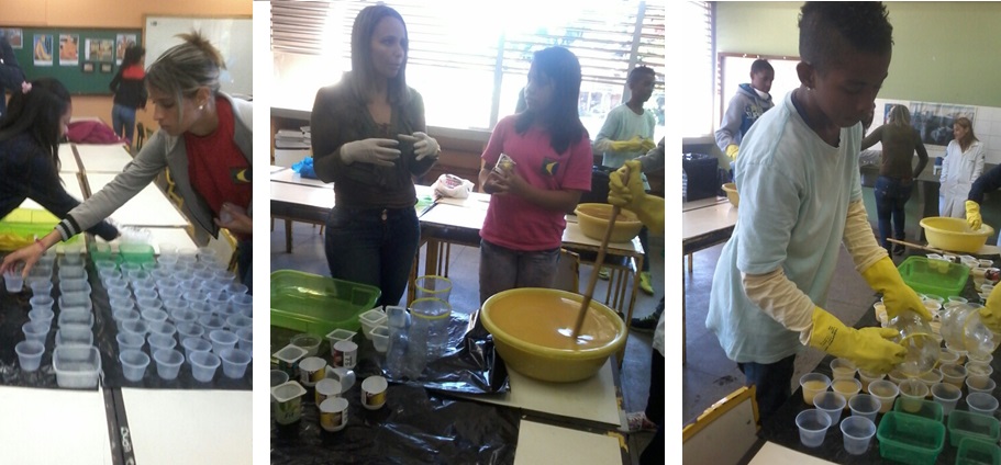 Um outro tema abordado em conjunto foi a necessidade do uso de materiais de proteção ( EPI – Equipamentos de proteção individual), pois na fabricação do sabão usamos produtos químicos corrosivos.